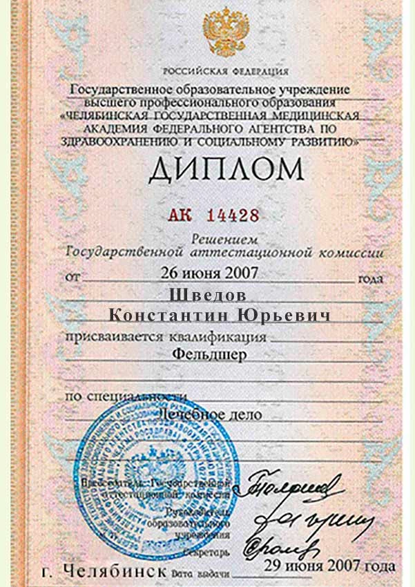 • 2007 г. — ГОУ ВПО «Челябинская государственная медицинская академия федерального агентства по здравоохранению и социальному развитию» (лечебное дело);