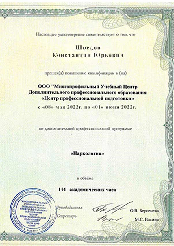 • 2022 г. — ООО «Многопрофильный Учебный Центр дополнительного профессионального образования Центр Профессиональной подготовки» (повышение квалификации по программе «Наркология»).
